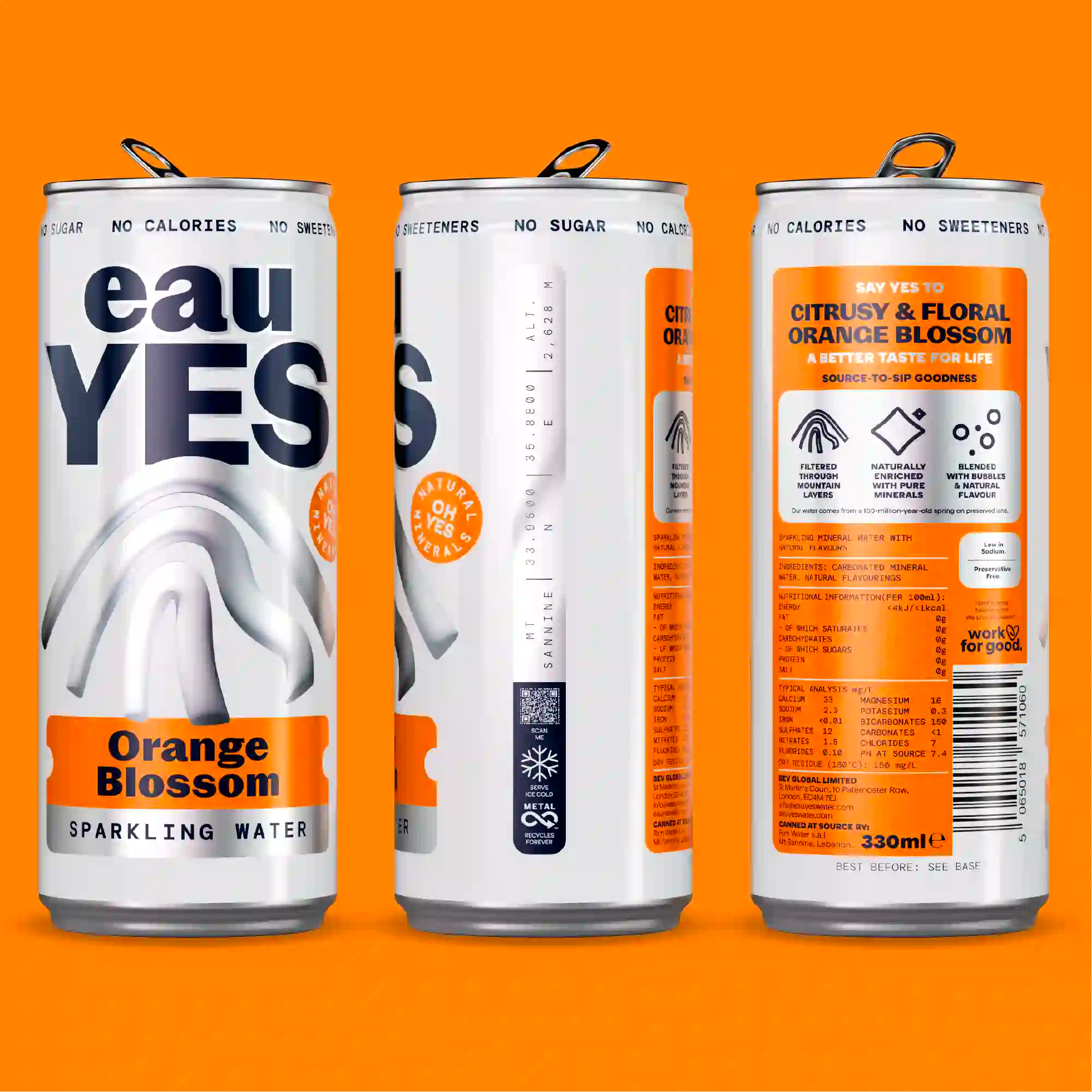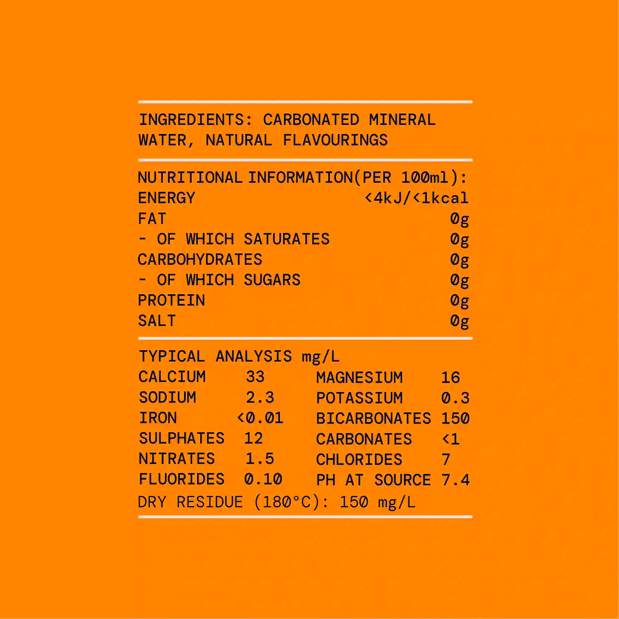 Unprocessed mineral water. Soft sparkle. Natural orange blossom flavour.